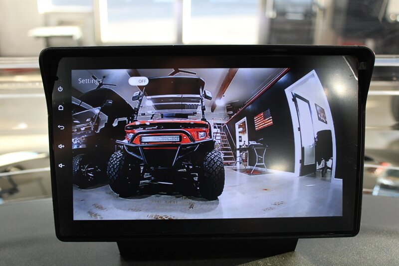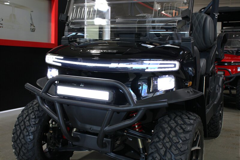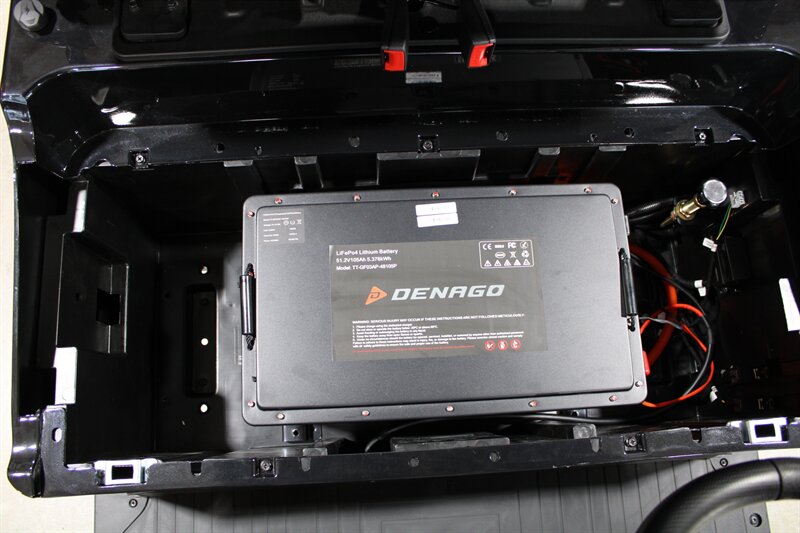 Apple CarPlay & Android Auto, 10.1 Inch Display, 4 Wheel Hydraulic Brakes, Integrated Turn Signals, Extended Roof Top, Premium Seats, Tilt Steering, Floor Mats, 5KW AC Electric Motor by Denago, Powder-Coated Alum. Chassis with 2.5" Lift, On-board Lithium Quick Charger, Four Wheel Disc/Electromagnetic Brakes, 14-inch Aluminum wheels with 23x10-14 DOT Approved Tires, USB/USB-C PD Ports, Rear Camera, Cart Specs: 118in x 49in x 80in, 25 MPH Speed with a 40 Mile Range, 51.2V 105Ah LiFePo4 Lithium Battery