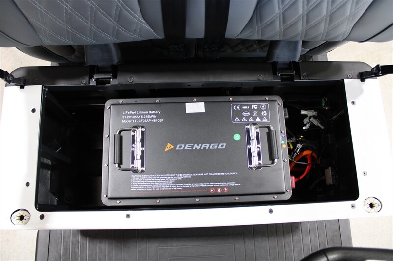 Apple CarPlay & Android Auto, 10.1 Inch Display, 4 Wheel Hydraulic Brakes, Integrated Turn Signals, Extended Roof Top, Premium Seats, NFC Touch Switch Sound Bar System, Tilt Steering, Floor Mats, 5KW AC Electric Motor by Denago, Powder-Coated Alum. Chassis with 2.5" Lift, On-board Lithium Quick Charger, Four Wheel Disc/Electromagnetic Brakes, 14-inch Aluminum wheels with 23x10-14 DOT Approved Tires, USB/USB-C PD Ports 110V AC Outlet, Rear Camera, Cart Specs: 118in x 49in x 80in, 25 MPH Speed with a 40 Mile Range, 51.2V 105Ah LiFePo4 Lithium Battery